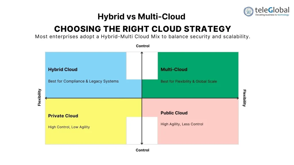 Hybrid cloud infrastructure offers stronger compliance, while multi-cloud requires strict governance.